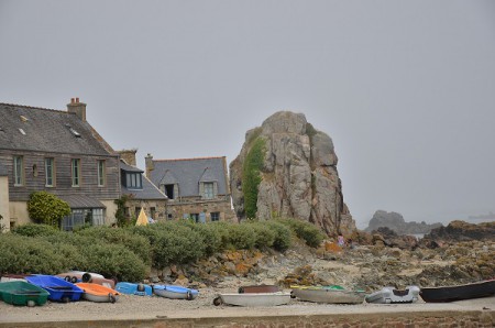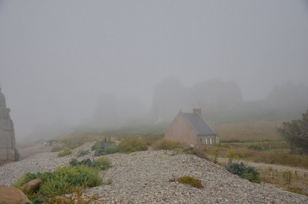 Klapka poprvé. Dům mezi skalami. Ale co pak se nestalo. Mlha. Místo balvanů růžové barvy, která přechází přes červenou, okrovou až do fialové, vidíme natož sem tam flíček. Šedý. Rozpaky střídá nadšení z odhalení. Odhalení pravé tváře Bretaně. Tak toto je ona. Smutná, tajemná, schovaná pod šerosvitem bájných legend. Země svých otců, hrdá, nikým nepoddajná. Kde hluk vln a větru je asi věčný... Dům mezi skalami nepokoříme. Ale my se vrátíme.